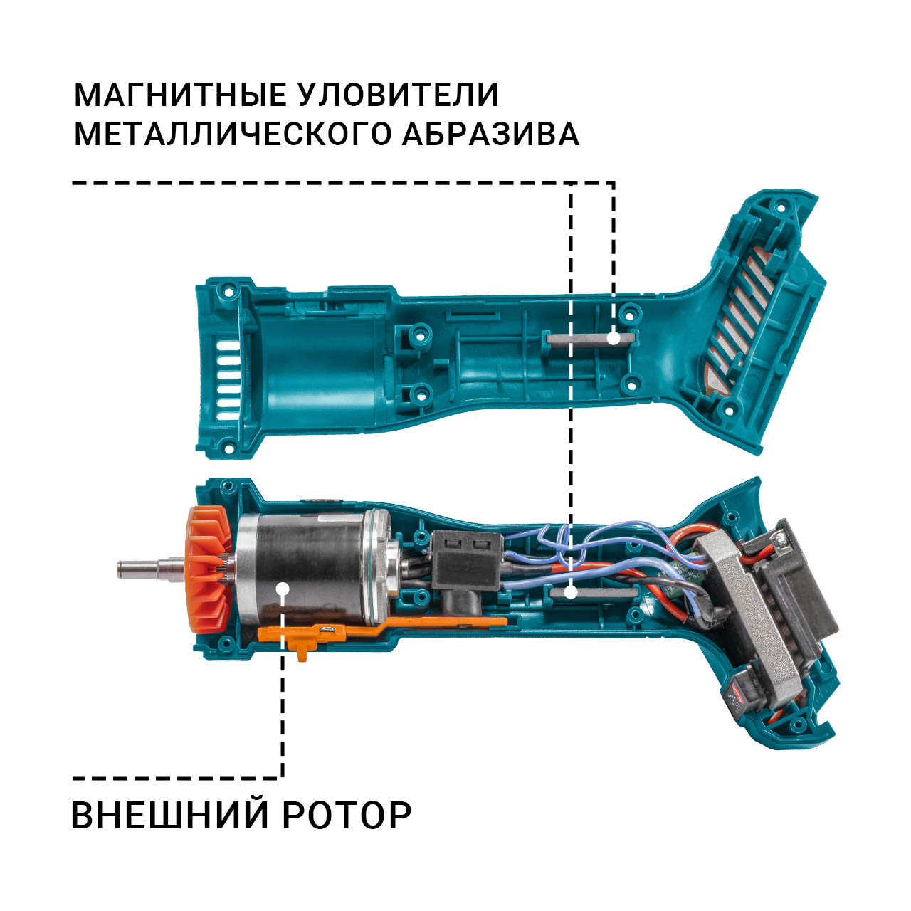 - Внутри: 2 мощных магнита создают ловушку для мелкой металлической пыли, не давая ей долететь до обмоток и повредить «сердце» инструмента.