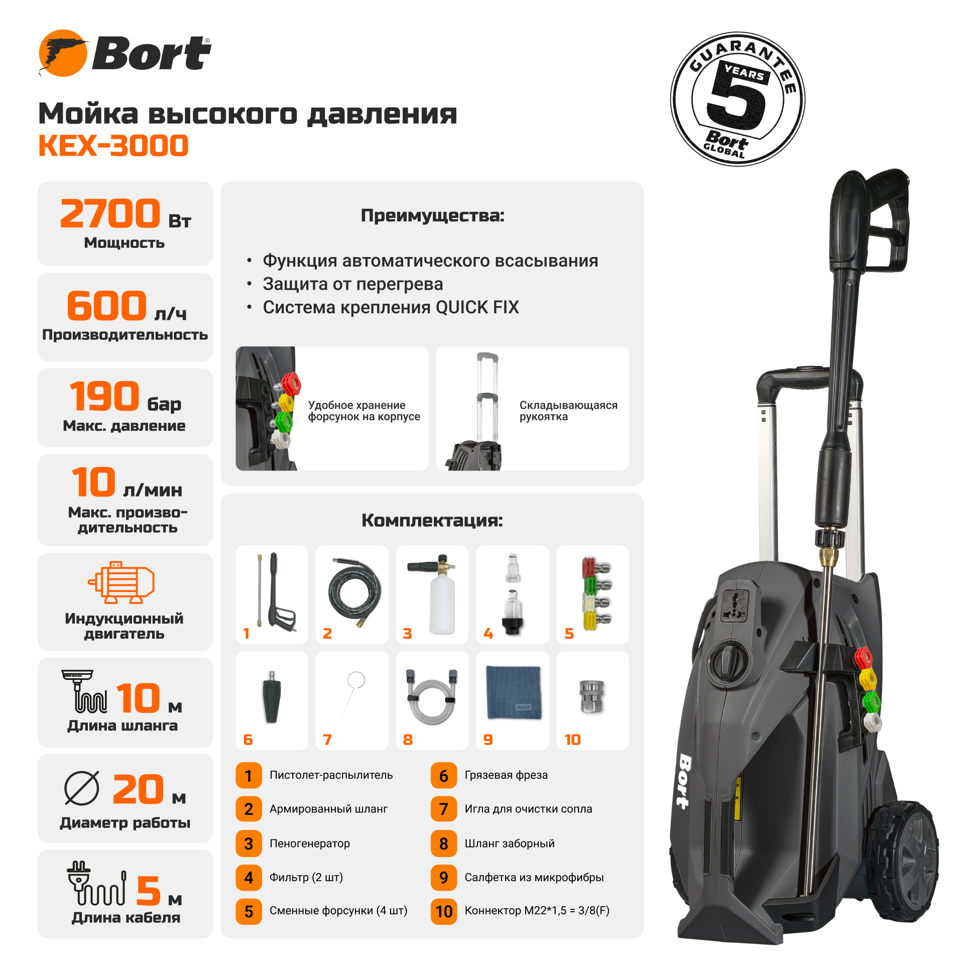 Забудьте навсегда о тряпках, щетках, швабрах, ведрах и другом уборочном инвентаре. С мойкой высокого давления BORT KEX-3000 вам все это больше не потребуется! Вы легко и быстро очистите фасады зданий, садовые дорожки, помоете машины, велосипеды и мотоциклы. Мощная струя воды с моющим средством поможет устранить даже сильно застарелые загрязнения. Вопрос, как добраться до узких мест, удалить грязь из глубоких щелей, отныне не будет вас волновать.