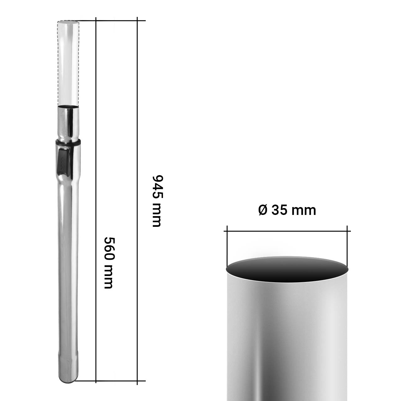 Телескопическая конструкция из стали — главное преимущество для пользователя. Трубка плавно регулируется по длине от 56 до 94,5 см, позволяя вам одним движением подобрать идеальную длину под конкретную задачу: убрать под низкой кроватью или достать до высокого карниза.